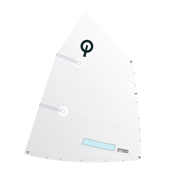 Optimist club racing sail made of strong 3.8 oz. high quality 100% dacron sailcloth. 6 panels with nickel plated eyes. Heavily reinforced corners. This sail comes folded, but is supplied with a long sail bag to store the sail rolled including spars. With window, untapered sail battens, class logo and IODA sail button, according to the IODA class rules.