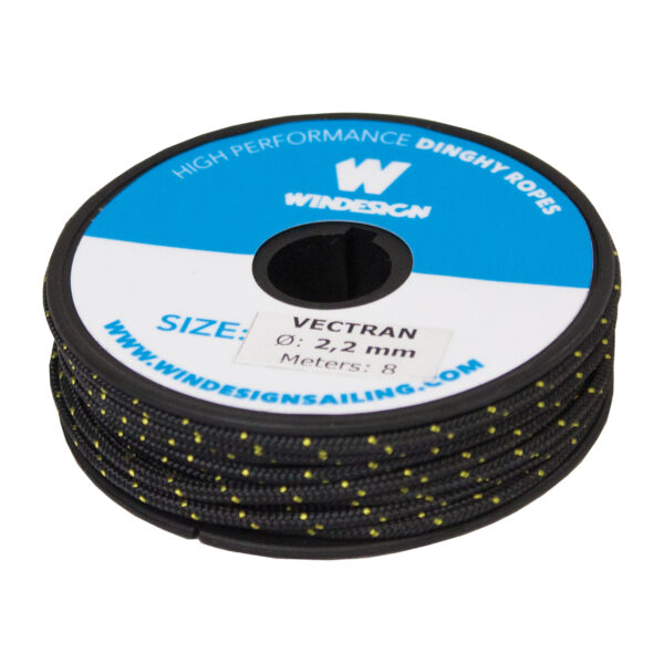 Mini reel 2.2 mm Vectran line black with gold fleck. For Optimist corner ties.