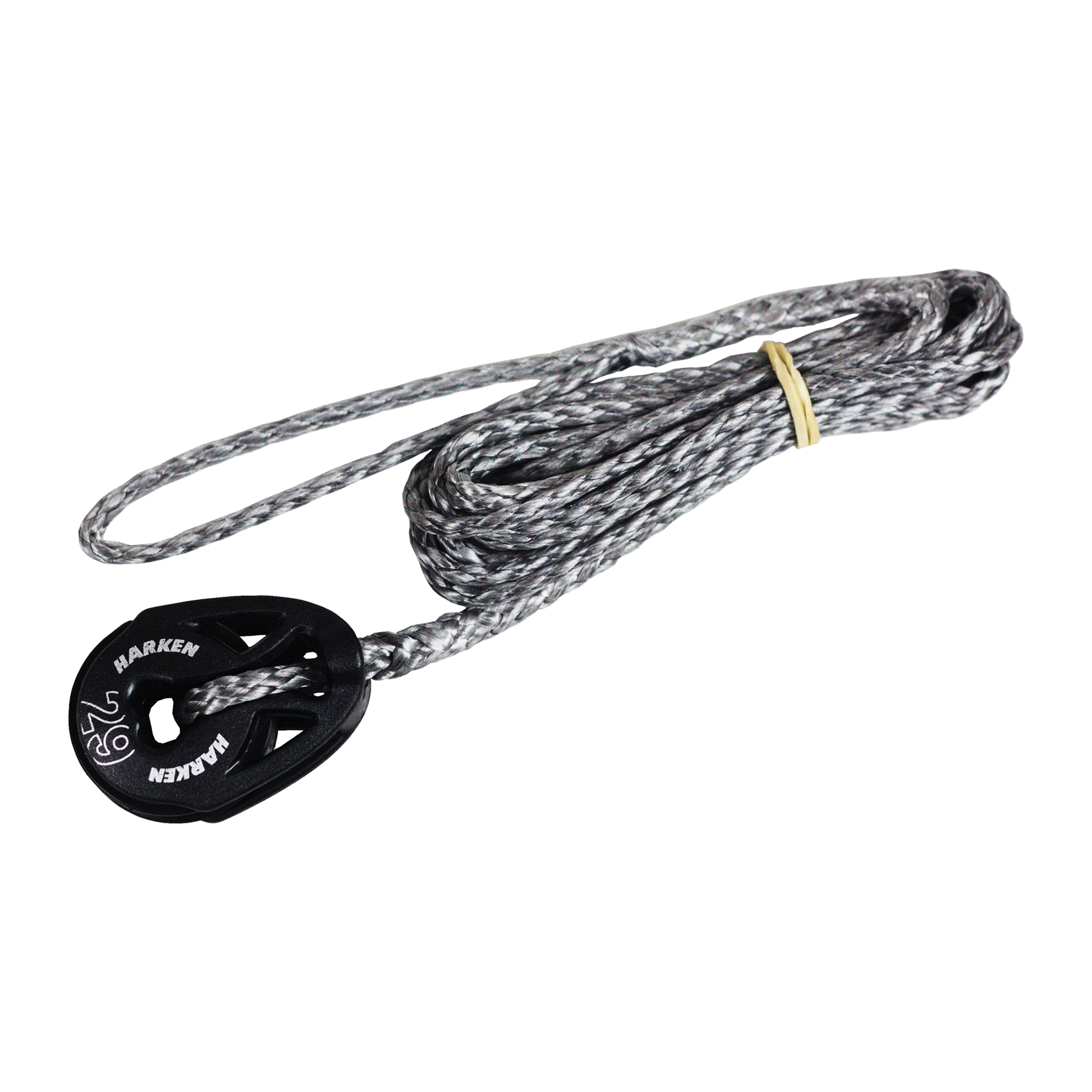 Outhaul primary part for Laser® Radial and MK2 and ILCA® 6 and 7 with a spliced 3 mm Dyneema® line with a 29 mm Harken Ti-Lite block. Made with a large loop which fits around the end of the boom for quick release.
