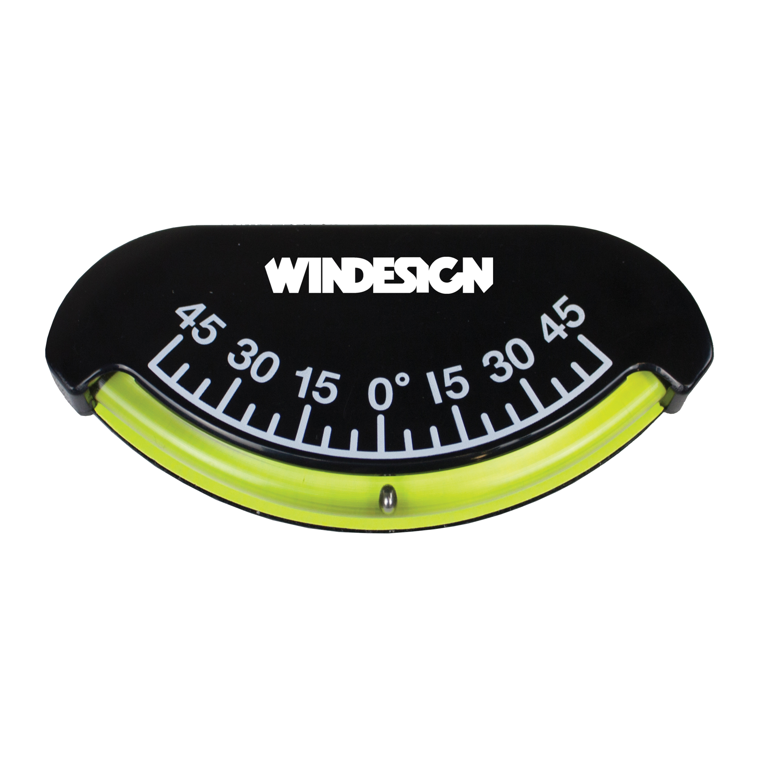 Affordable black plastic clinometer with self-adhesive backing for easy fitting. An accurate bubble gauge shows the boat angle up to 45 degrees.