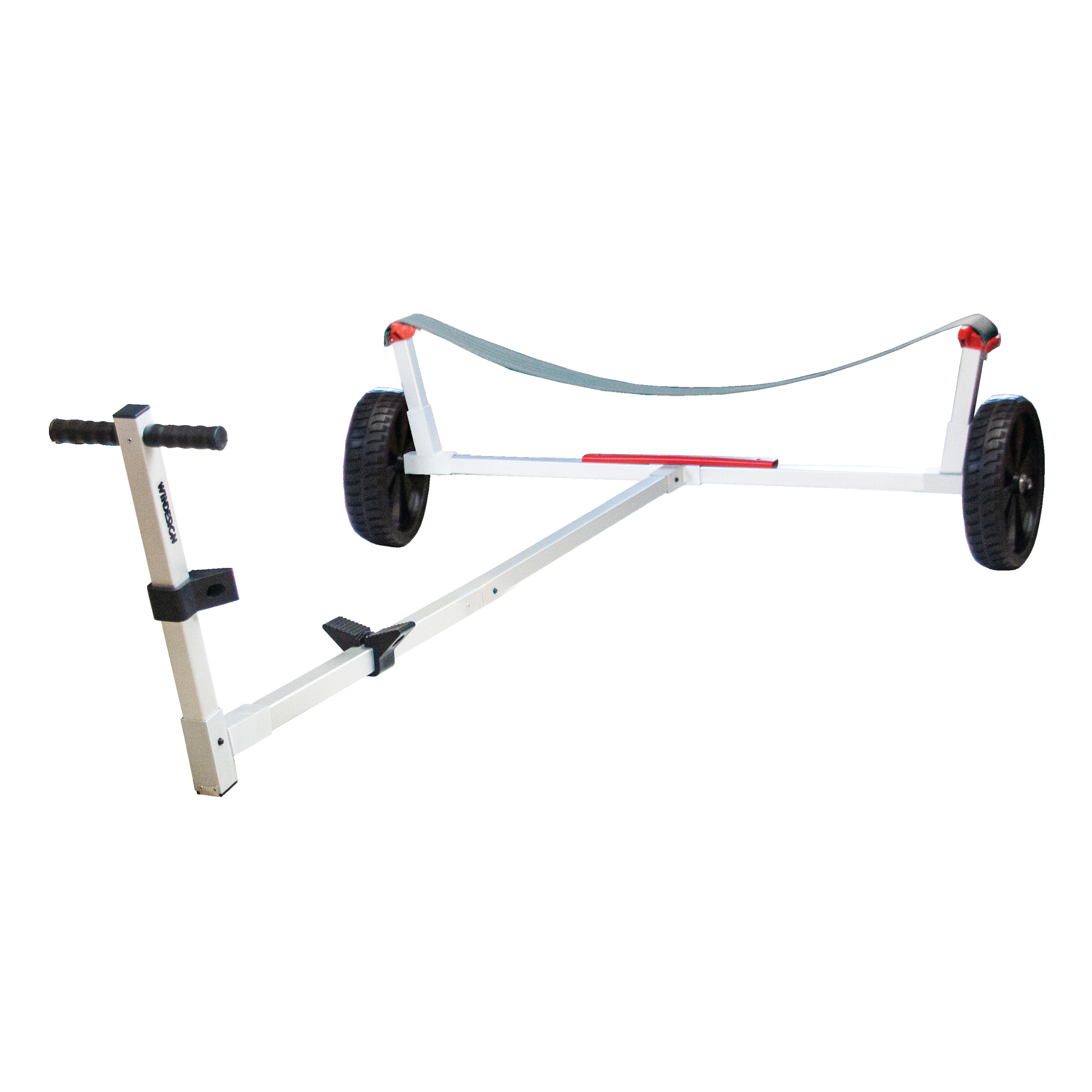Lightweight aluminium trolley for the Zoom dinghy. Spring locking quick release of all parts allows the trolley to be disassembled in a matter of seconds for storage and travel. The frame has welded joints and is anodized to prevent corrosion. This trolley is supplied with 8 mm stainless steel push button wheel locks which are mounted inside the stainless steel axles. Supplied with the large Durastar-lite puncture proof wheels, v-supports, side supports and heavy duty 90 mm wide polyester webbing belt.