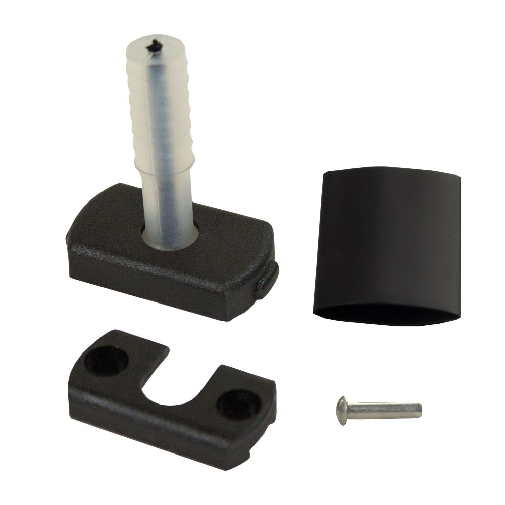 This releasable rubber joint for 16 mm tiller extionsions is mounted with an aluminium pin only. The rope core will avoid complete failure should the rubber tear. Mounted with pin which is kept in place by a piece of heat shrinkable tubing. The distance between the mounting hole centers of all joints is 32 mm. To remove a joint: simply cut off the tubing and push the pin out.