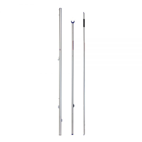 The UPGRADED Optimist mast is fitted with a stainless steel halyard block, aluminium Clamcleats, a nylon pin stop and two stainless steel eyes for fixing the head of the sail. The Optimist SCHOOL boom has blue nylon in- and outboard end fittings, a nylon outhaul cleat and nylon fittings for mainsheet and downhaul attachment. The UPGRADED Optimist sprit has blue sprit ends and 15 cm black tubing for protecting damage between the mast and the sprit.