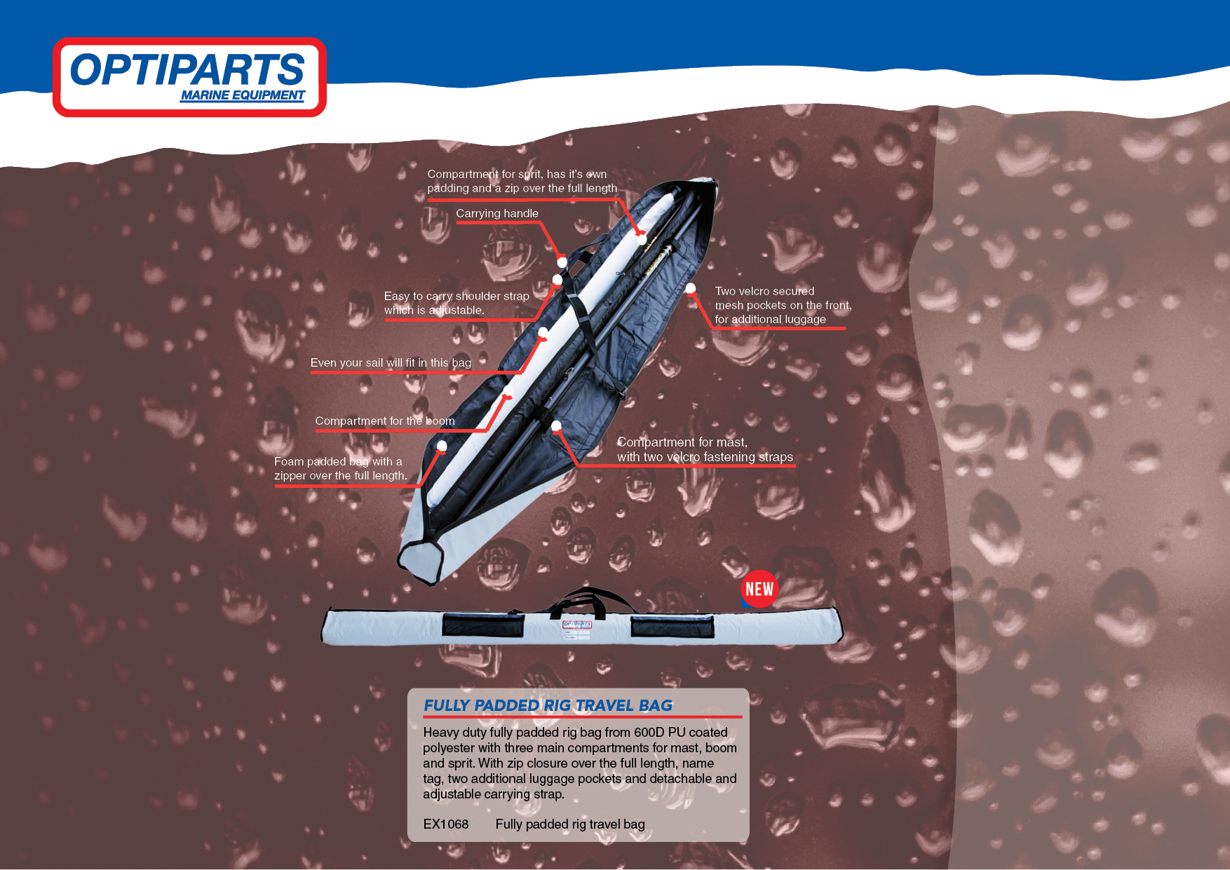 Heavy duty fully padded rig bag from 600D solution dyed polyester with three main compartments for mast, boom and sprit. With zip closure over the full length, name tag, two additional luggage pockets and detachable and adjustable carrying strap.