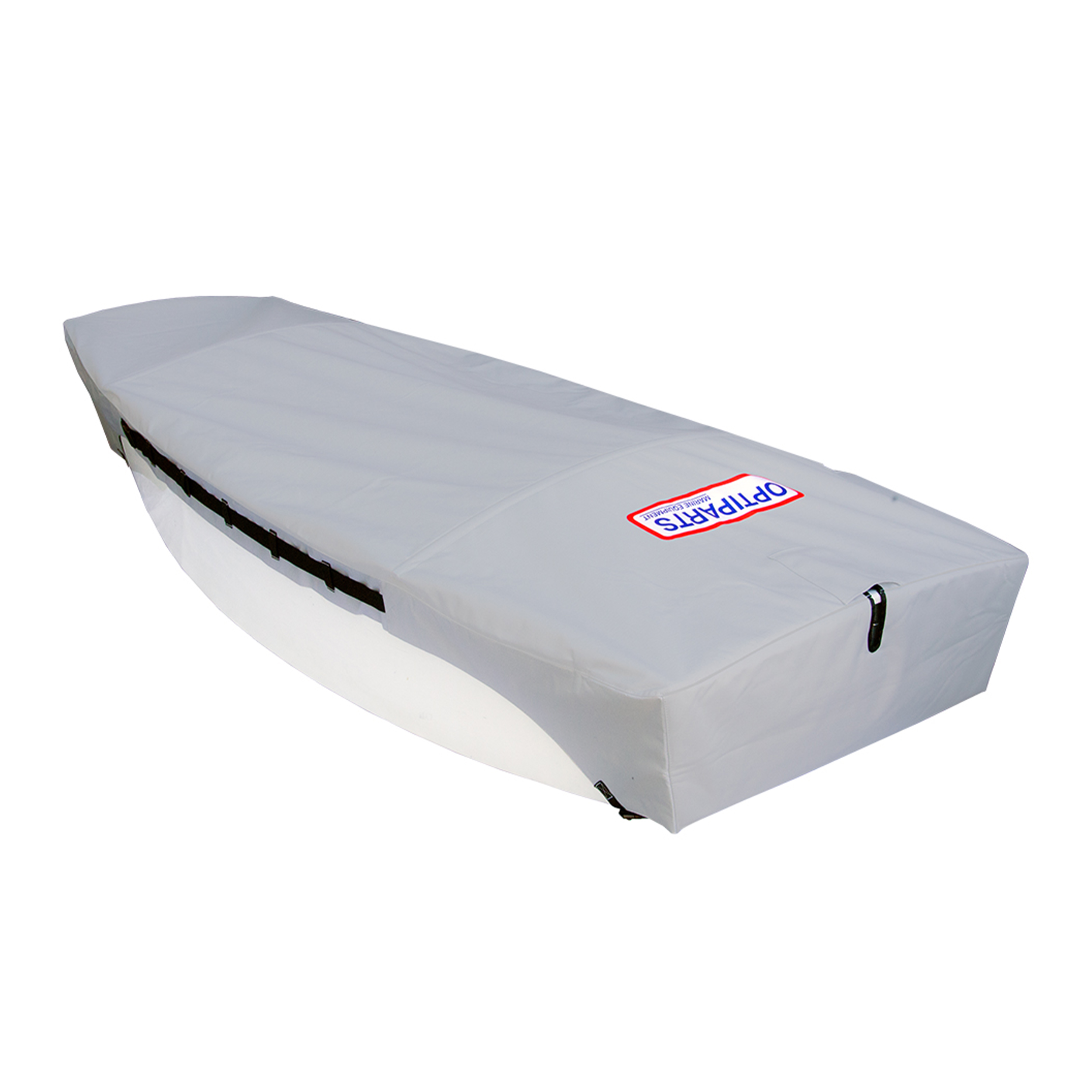 This cover has two sailbattens integrated in the top panel. The top panel will be tented when the webbing straps connected to both ends of each batten are tensioned. Made of grey 600D PVC ripstop polyester. The padded panels on the front, back and sides fold around the corners and protect your hull.