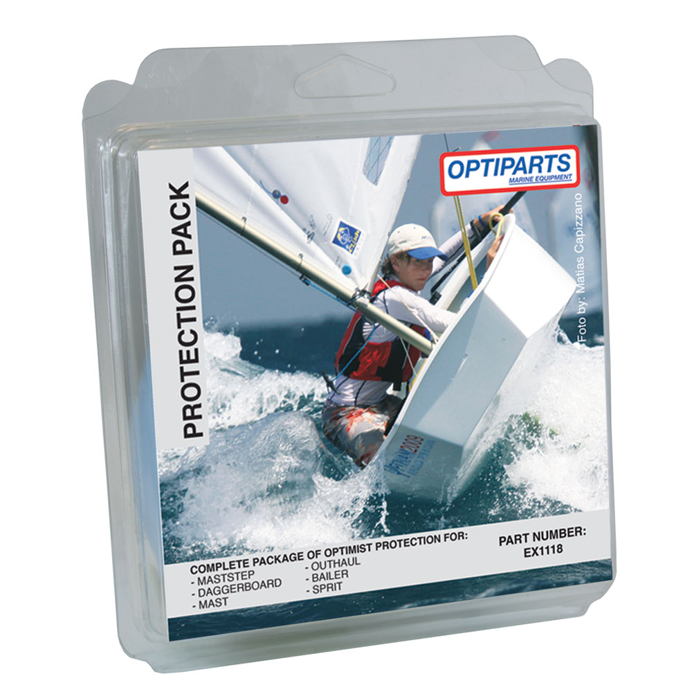 This kit contains 29 pieces of ultra-high molecular weight polyethylene tape. This tough, high-impact thermoplastic material is backed with a strong acrylic adhesive and designed to protect key areas of your Optimist sailboat. The kit includes various strips and disks to shield the maststep, outhaul, daggerboard slot, and boat corners from wear and tear. Additionally, it comes with an 11-meter roll of rigging tape and daggerboard stoppers, making it a complete solution for protecting your Optimist during sailing.