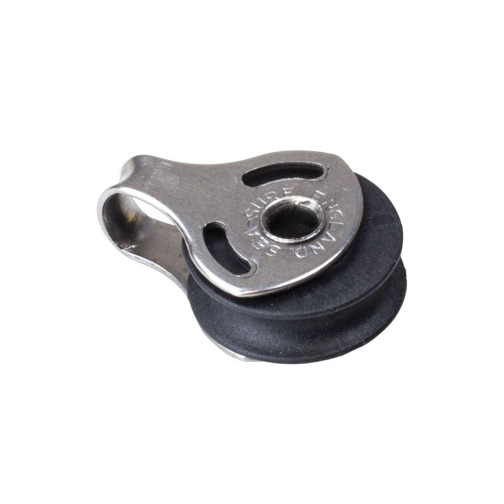Plain bearing Optimist halyard block as used on Optimist Silver masts. With stainless steel cheeks and nylon 19mm sheave.