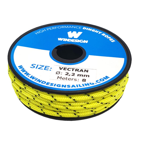 Mini reel 2.2 mm Vectran line fluor yellow with black fleck. For Optimist corner ties.