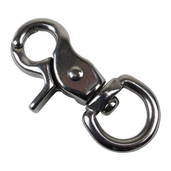 Stainless steel 316 trigger snap safety shackle for the Optimist. Can be opened with one hand. Length 49 mm, weighs 20 grams.