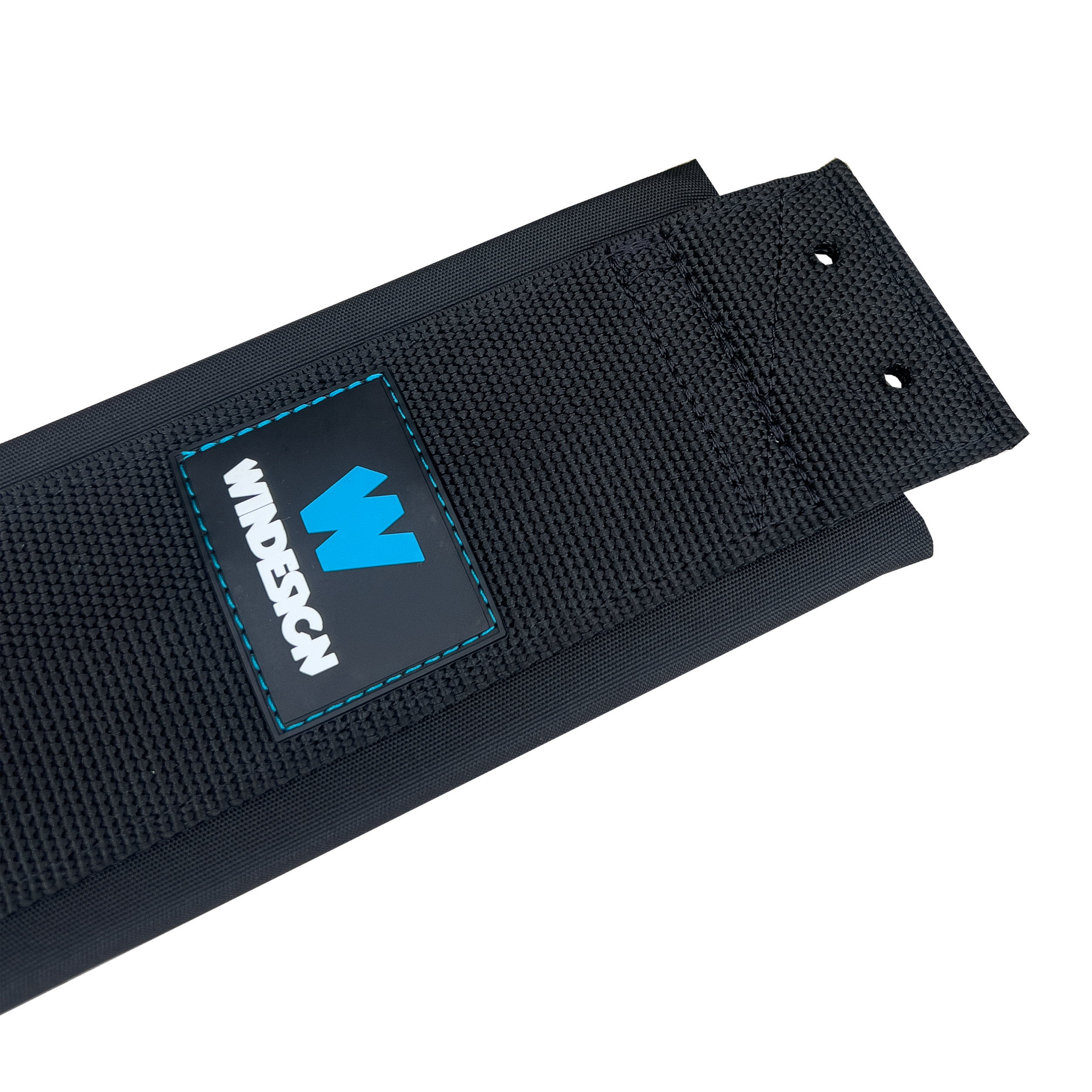 A 10 cm extra wide PRO padded Laser® / ILCA® hiking strap. Black webbing, partly covered with black wear resistant cloth that is perfectly UV resistant. It’s filled with an extra stiff close-cell foam plate material which does not absorb water and fitted with a rubber grip underneath. Loop on the aft and mounting holes on the front.