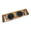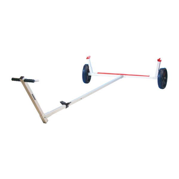 Laser® / ILCA® trolley with 2-piece spring lock quick release middle section which allows you to disassemble the trolley in matter of seconds for storage and travel. Made of square aluminium tube with rounded corners. The frame has welded joints and is anodized to prevent corrosion. The bow locks into a horseshoe shaped padded support and the hull rests on 2 side supports which lock under the gunwale. This provides a stable support for the Laser® and ILCA®. It comes with a firm/soft rubber v-support (EX2017) which will let your Laser® / ILCA® remain better on the trolley, and you can even better prevent your hull for any damage. Supplied with the large Durastar-lite puncture proof wheels.