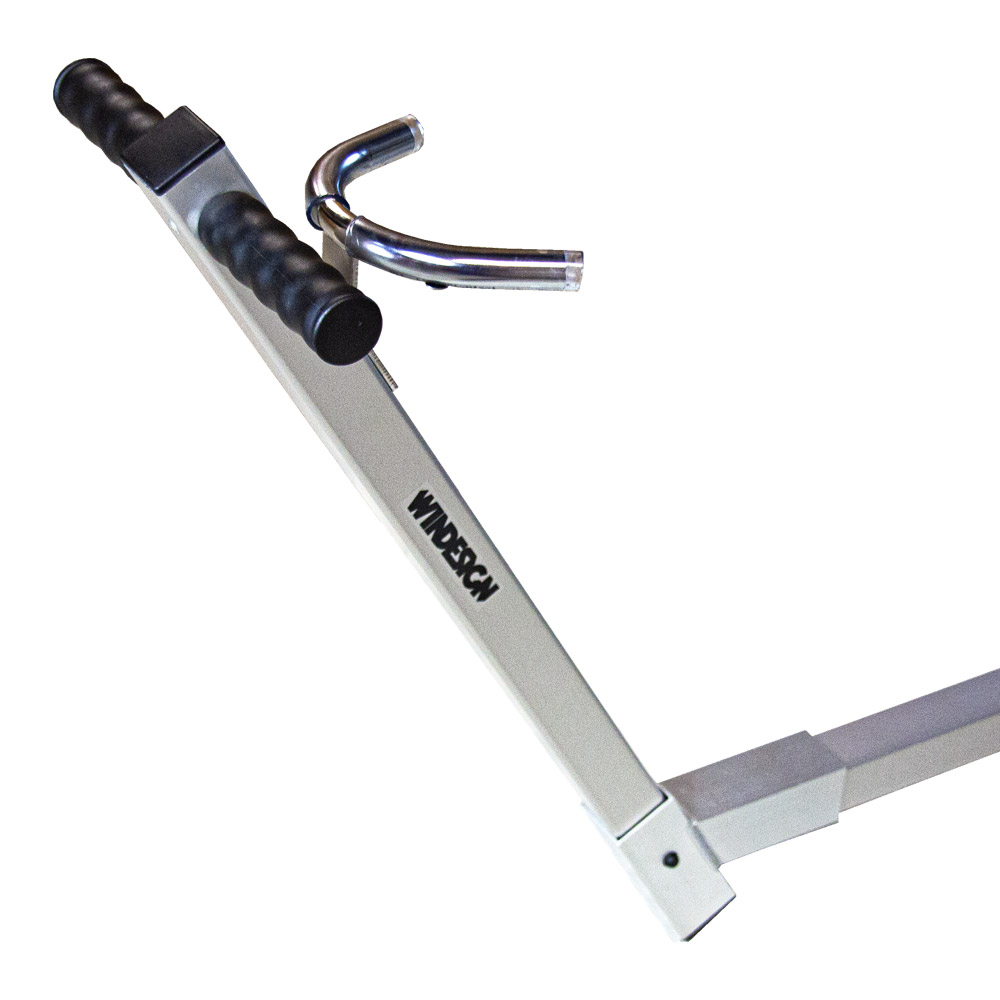 Laser® / ILCA® trolley with 2-piece spring lock quick release middle section which allows you to disassemble the trolley in matter of seconds for storage and travel. Made of square aluminium tube with rounded corners. The frame has welded joints and is anodized to prevent corrosion. The bow locks into a horseshoe shaped padded support and the hull rests on 2 side supports which lock under the gunwale. This provides a stable support for the Laser® and ILCA®. It comes with a firm/soft rubber v-support (EX2017) which will let your Laser® / ILCA® remain better on the trolley, and you can even better prevent your hull for any damage. Supplied with the large Durastar-lite puncture proof wheels.