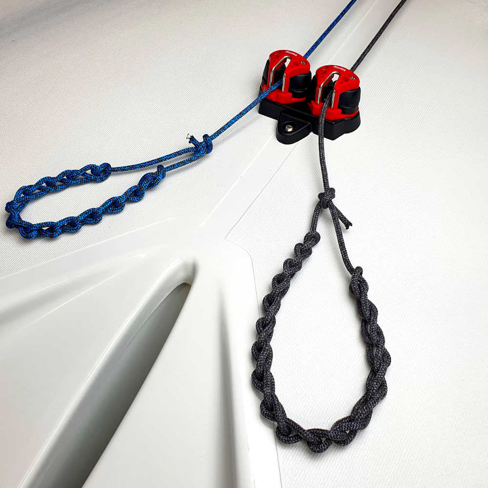 Cunningham system for Laser® MK2 and ILCA® 7 with a spliced 4 mm Dyneema® primary line and two Harken 29 mm T2 soft-attach blocks. Comes with a 4 mm DB-Racing secondary control line, consists of a Dyneema® core and Technora / polyester cover for ultimate durability and grip. The spliced primary line is advised to attach around the lower mast loop (EX2225). Cut at ideal length for direct use and the ability to add a loop handle or braided handle.