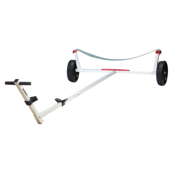 Lightweight aluminium trolley for the Laser® Pico. Spring locking quick release of all parts allows the trolley to be disassembled in a matter of seconds for storage and travel. The frame has welded joints and is anodized to prevent corrosion. This trolley is supplied with 8 mm stainless steel push button wheel locks which are mounted inside the stainless steel axles. Supplied with the large Durastar-lite puncture proof wheels, v-supports, side supports and heavy duty 90 mm wide polyester webbing belt.