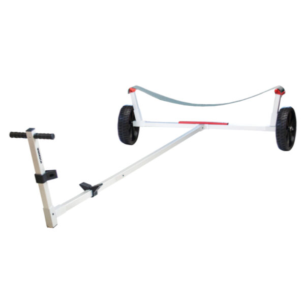 Lightweight aluminium trolley for the Topper Topaz. Spring locking quick release of all parts allows the trolley to be disassembled in a matter of seconds for storage and travel. The frame has welded joints and is anodized to prevent corrosion. This trolley is supplied with 8 mm stainless steel push button wheel locks which are mounted inside the stainless steel axles. Supplied with the large Durastar-lite puncture proof wheels, v-supports, side supports and heavy duty 90 mm wide polyester webbing belt.